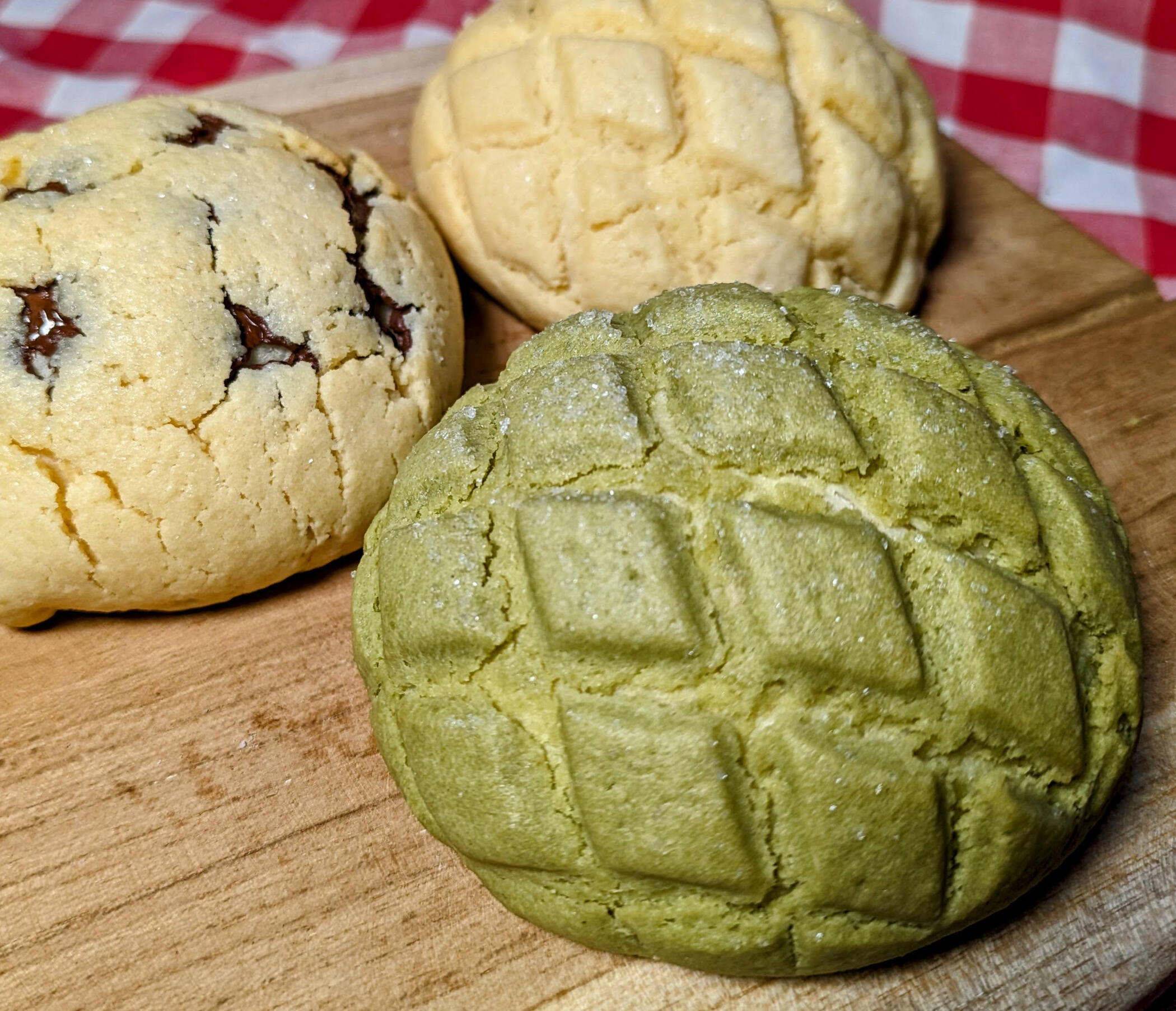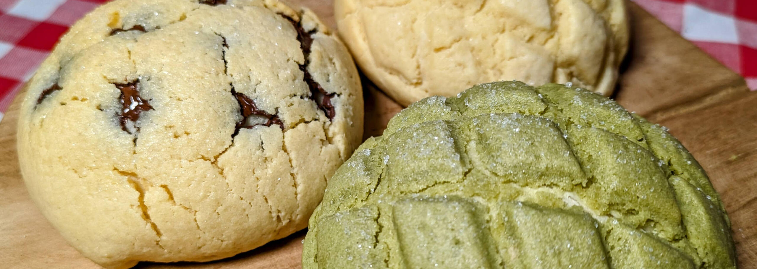 Melon pan is a ubiquitous snack in Japan. It also enjoys popularity around the rest of East Asia. It's a sweet bun topped with cookie dough and sugar. It's especially popular with young people, many students sneak one in for lunch from time to time.We currently sell three types. Our twist on the classic cookie topping is prepared with vanilla and almond meal. The two additional choices add chocolate chips or macha powder.